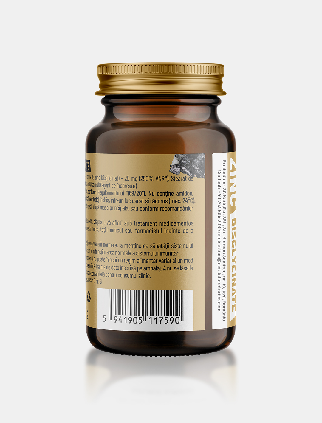 Fiecare tabletă conține: Zinc (sub formă de zinc bisglicinat) – 25 mg (250% VNR*), Stearat de magneziu vegetal (agent antiaglomerant), Isomalt (agent de încărcare) *Valoarea nutrițională de referință, conform Regulamentului 1169/2011.